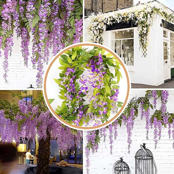 Sie müssen sich nicht mit Ranken oder Blumen herumschlagen, die verblassen und verwelken. Unsere Simulation von Glyzinien wird aus hochwertiger Seide und flexiblem Kunststoff hergestellt, damit sie ihre Vitalität für immer behalten. Diese langlebigen Blumen sind für eine lange Lebensdauer konzipiert und bieten Ihnen eine schöne und dauerhafte Dekorationslösung.