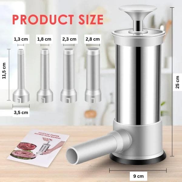 Dieser Wurstfüller enthält vier PP-Tüllen mit unterschiedlichen Durchmessern: 1,3cm. 1,8cm, 2,3cm und 2,8cm.